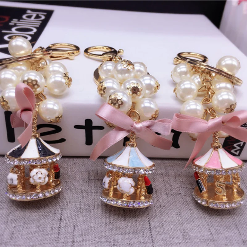 New Creative Fashion Carousel Key Chain Personality Trend Pearl Charm Key Chain Lady Cute Bag Mobile Phone Pendant Key Chain
