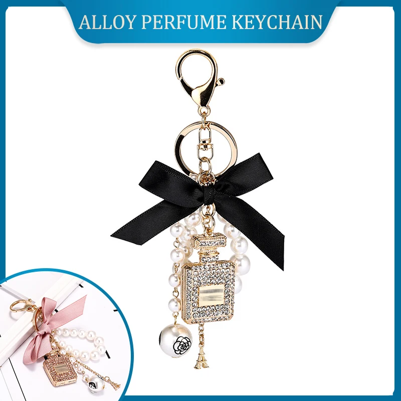 Good Chance of Creative hand-studded perfume bottle alloy key chain charm bow pearl pendant ladies bag mobile phone case pendant Birthday Gift