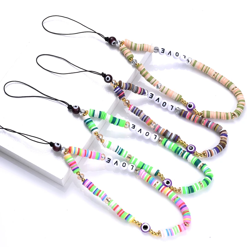 New Mobile Phone Jewelry Acrylic Letter Clay Polymer Spacer Beaded Mobile Phone Chain for Lady Girl Anti-Lost Lanyard Jewelry