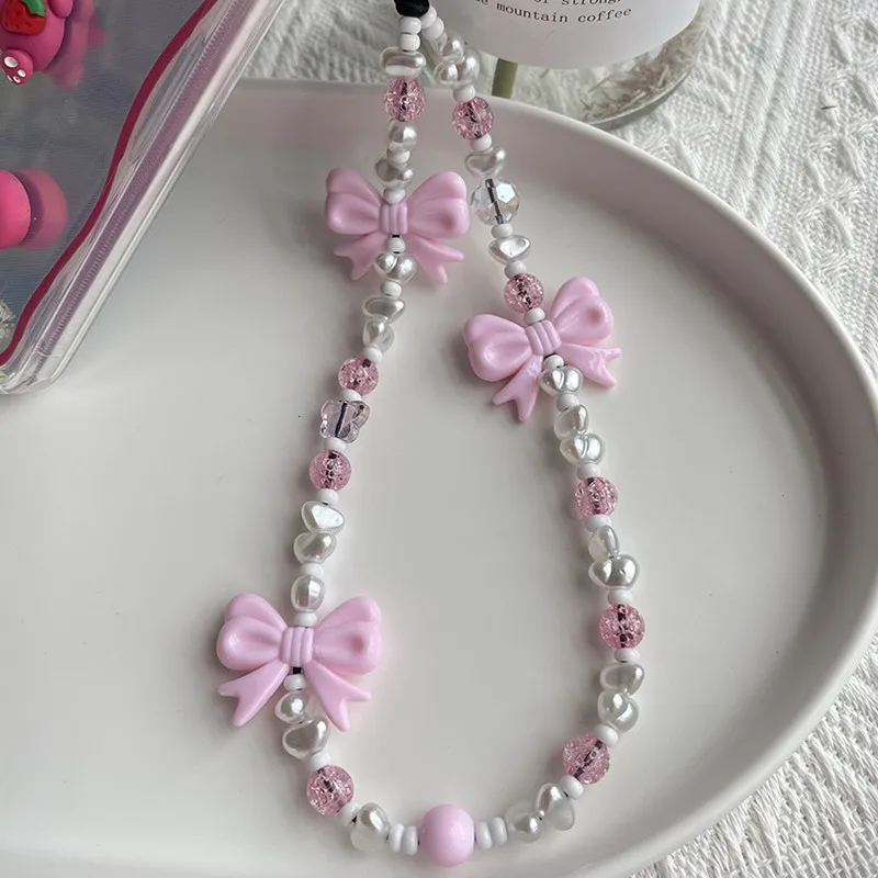 Addition Information of Simple Mobile Phone Chain Straps Charm Pink Bowknot Acrylic Imitation Pearl Phone Lanyard Anti-Lost Ladies Jewelry Accessories