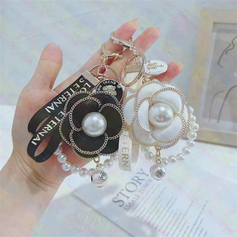 High Quality Pearl String Camellia Keychain Fashion Bag Pendant Ladies Car Keychain Pendant Wholesale Phone Charm Couple Gift