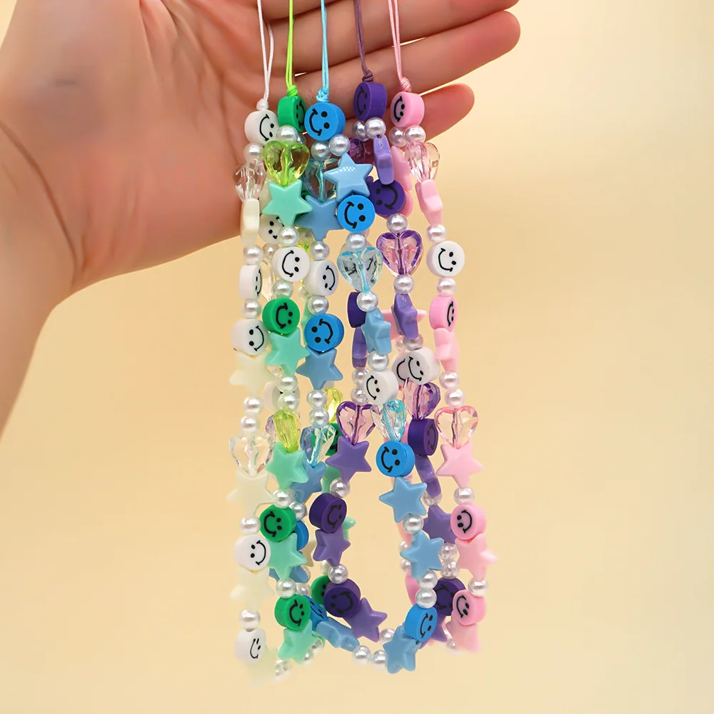 Colorful Smile Pearl Star Soft Pottery Mobile Phone Strap Lanyard For Women Ladies Fashion Jewelry Phone Case Hanging Cord